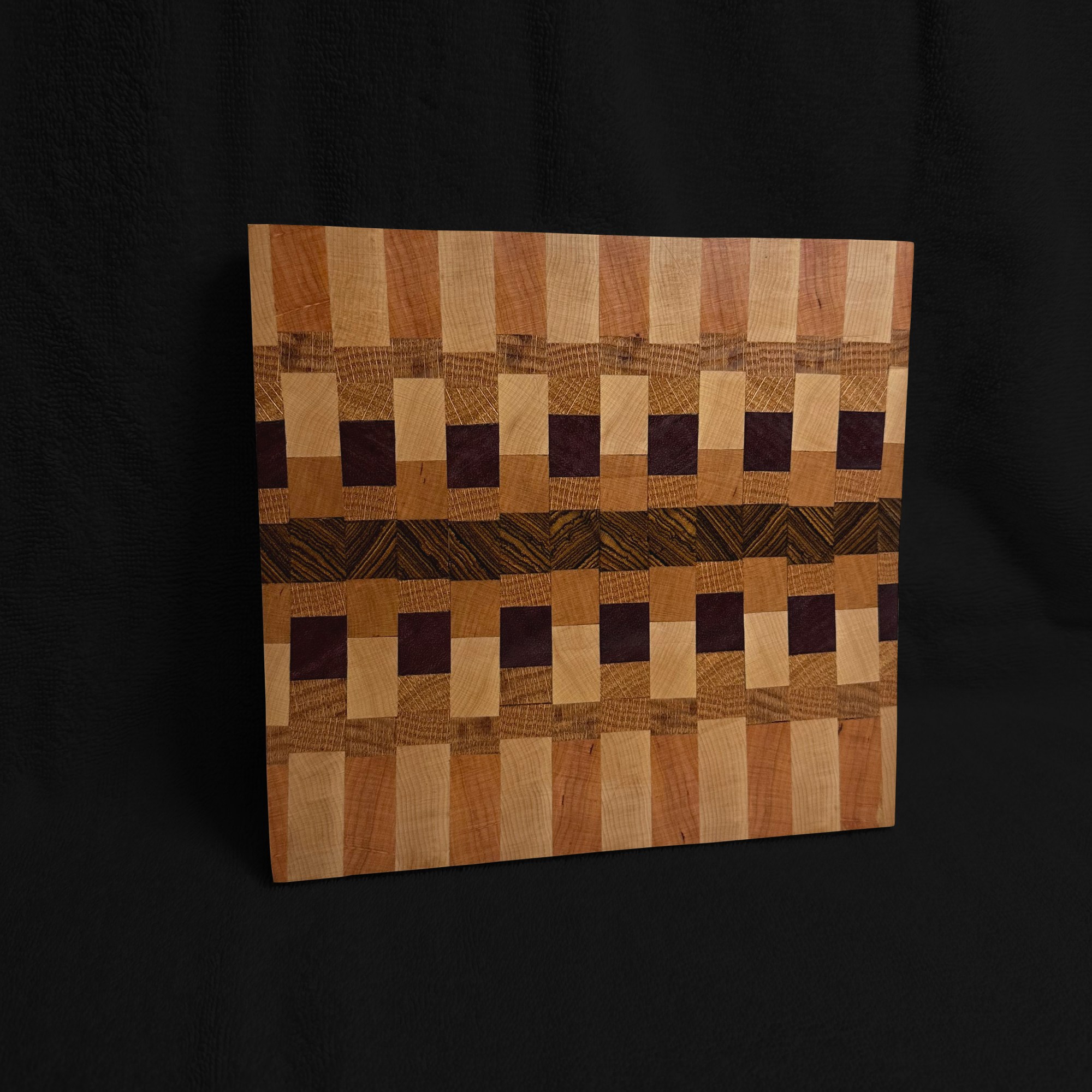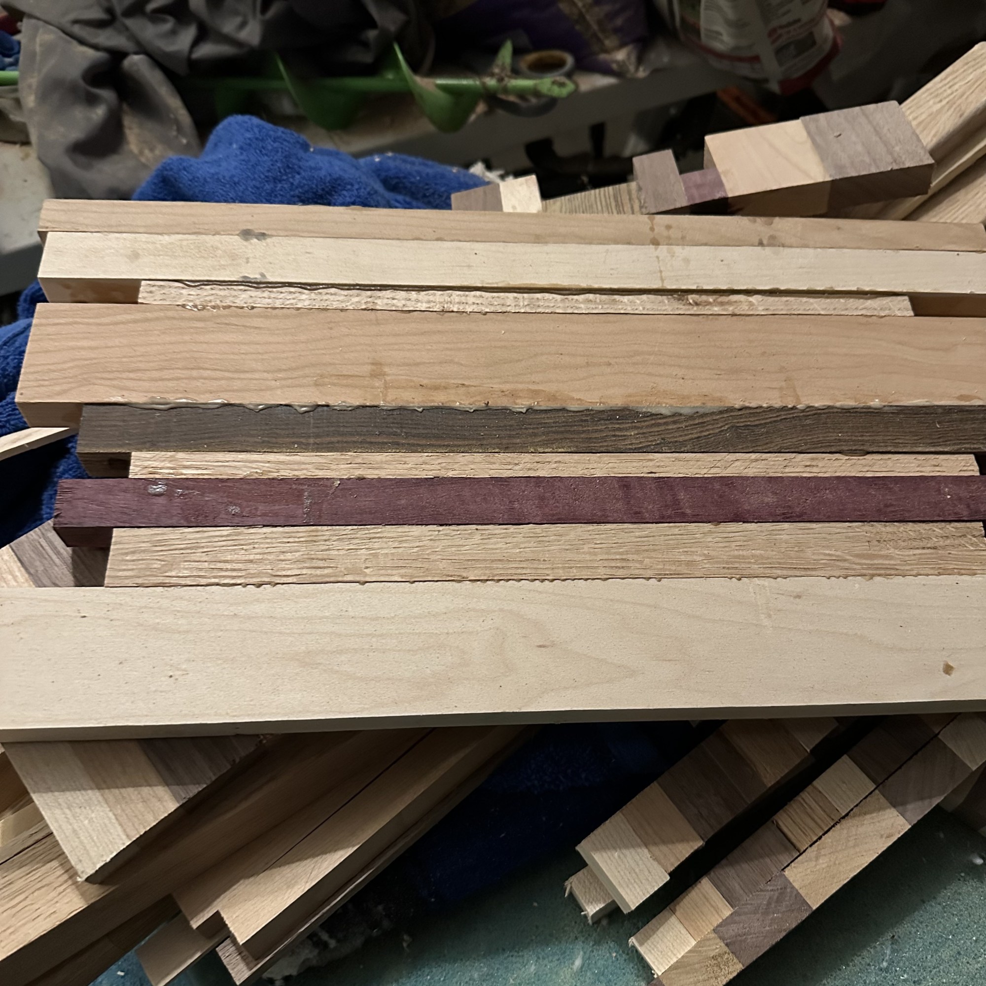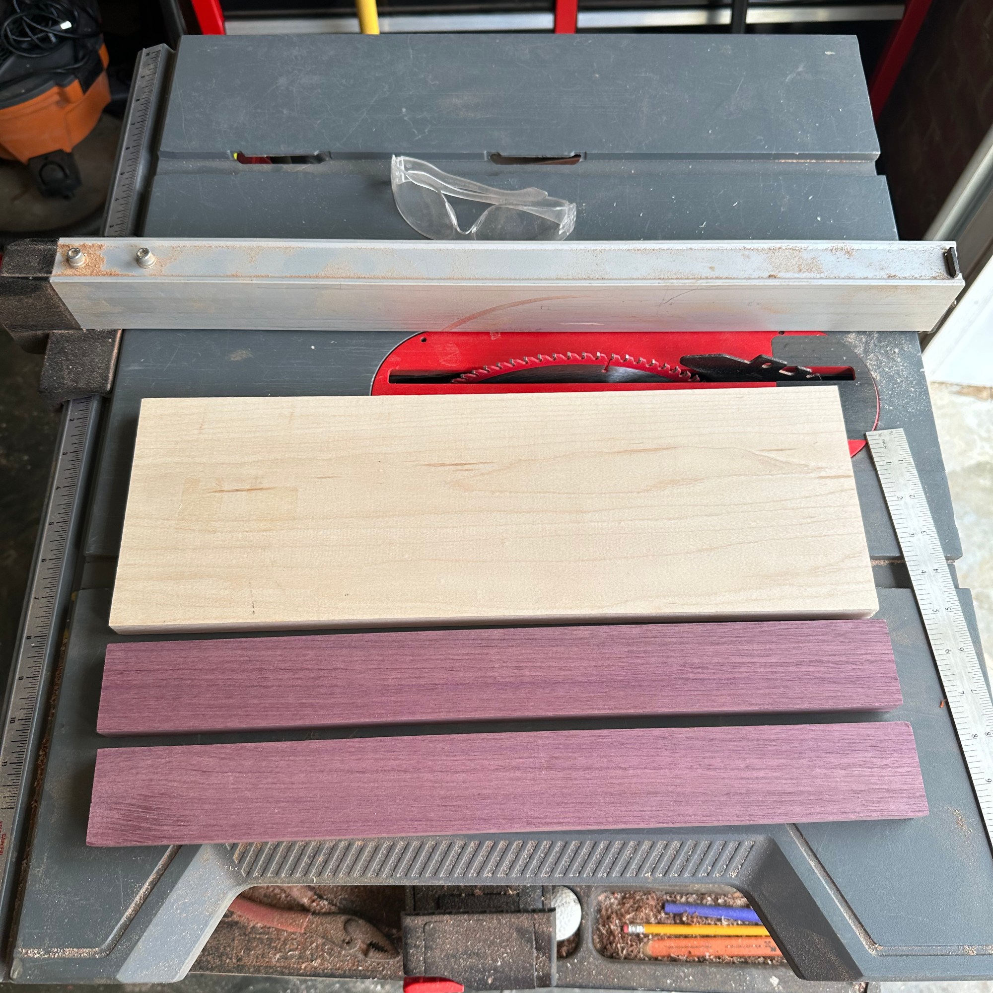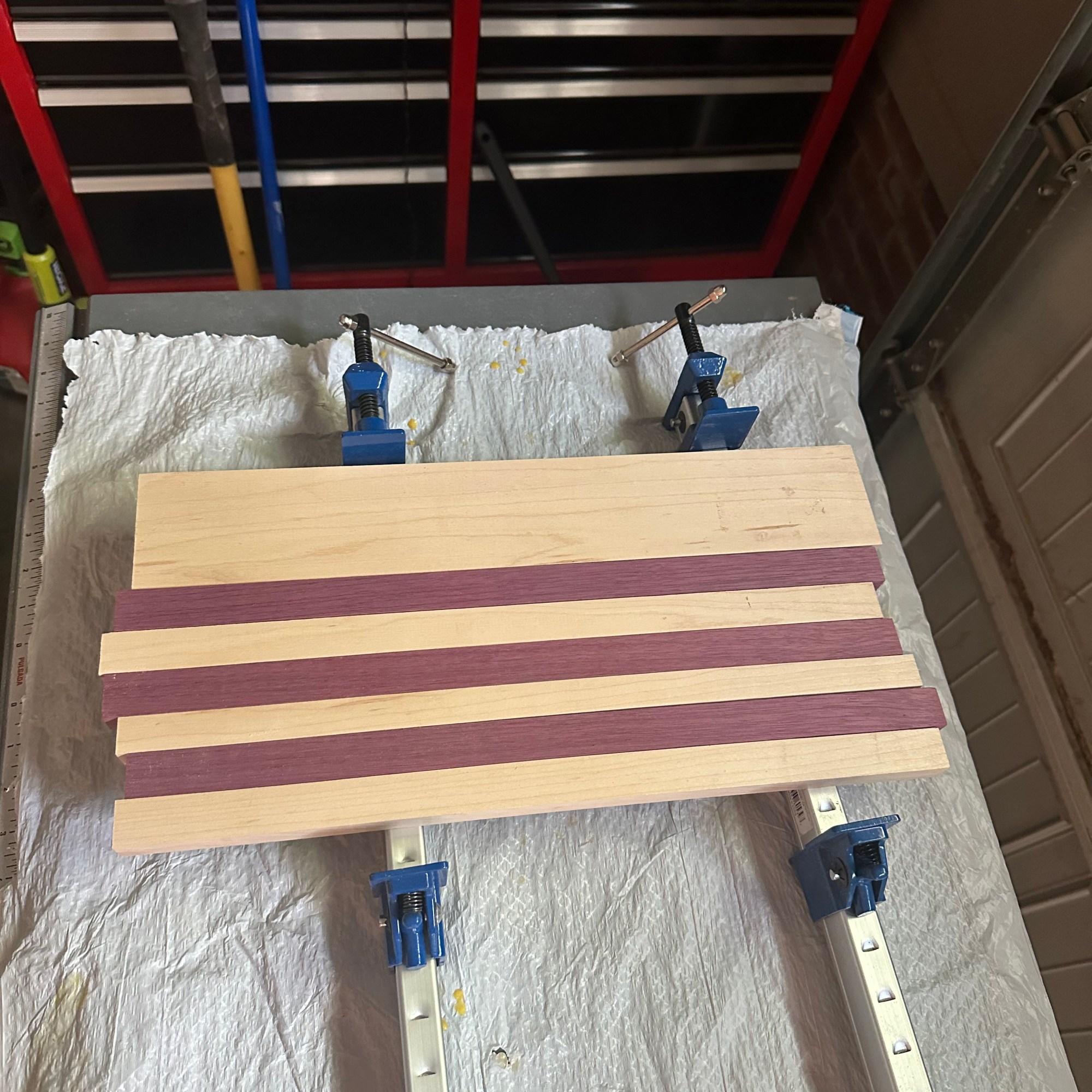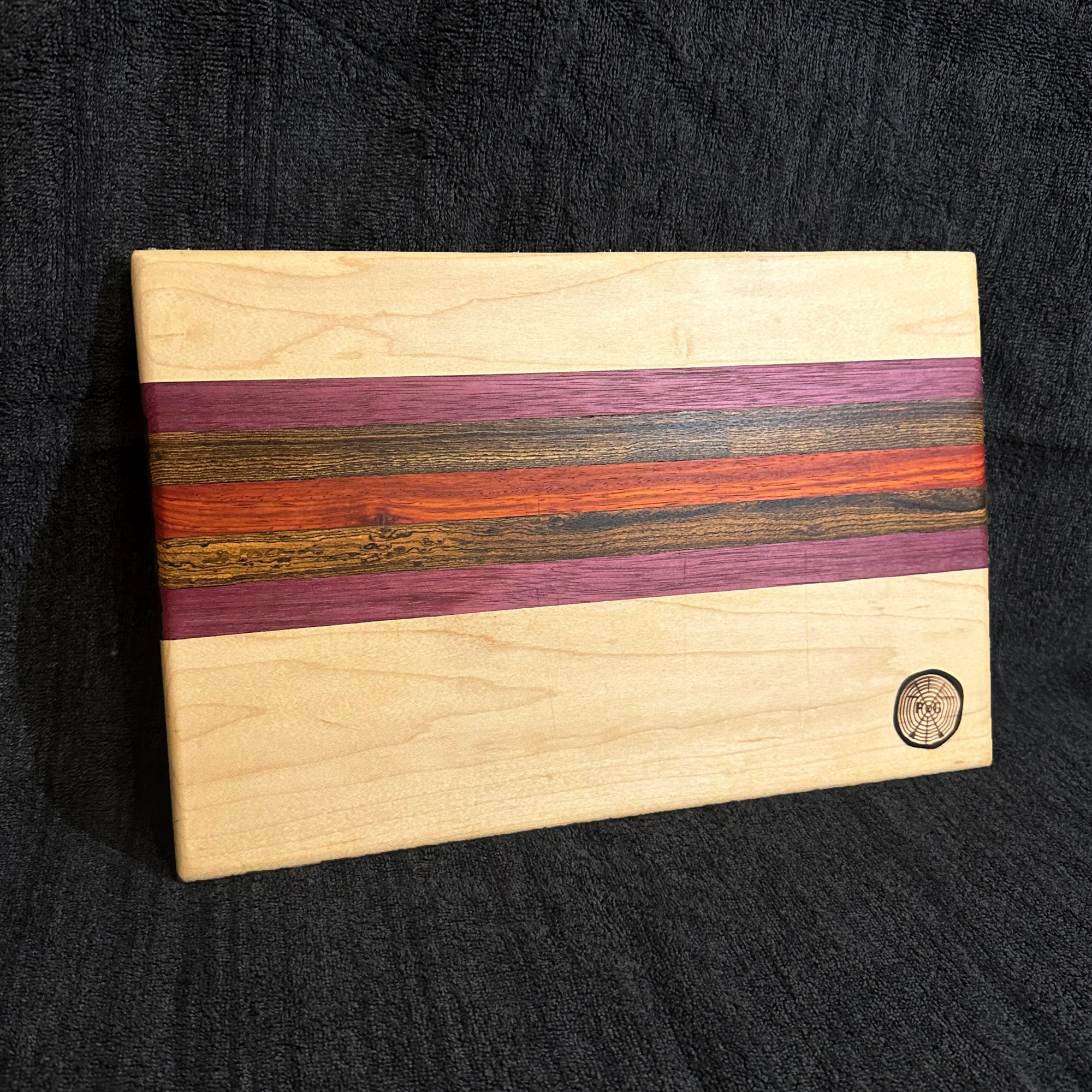 This is a cutting board I made with maple, purpleheart, bocote, and padauk woods! I was able to get a clean roundover on the edges, and I’m hoping the hardwood holds for a while!