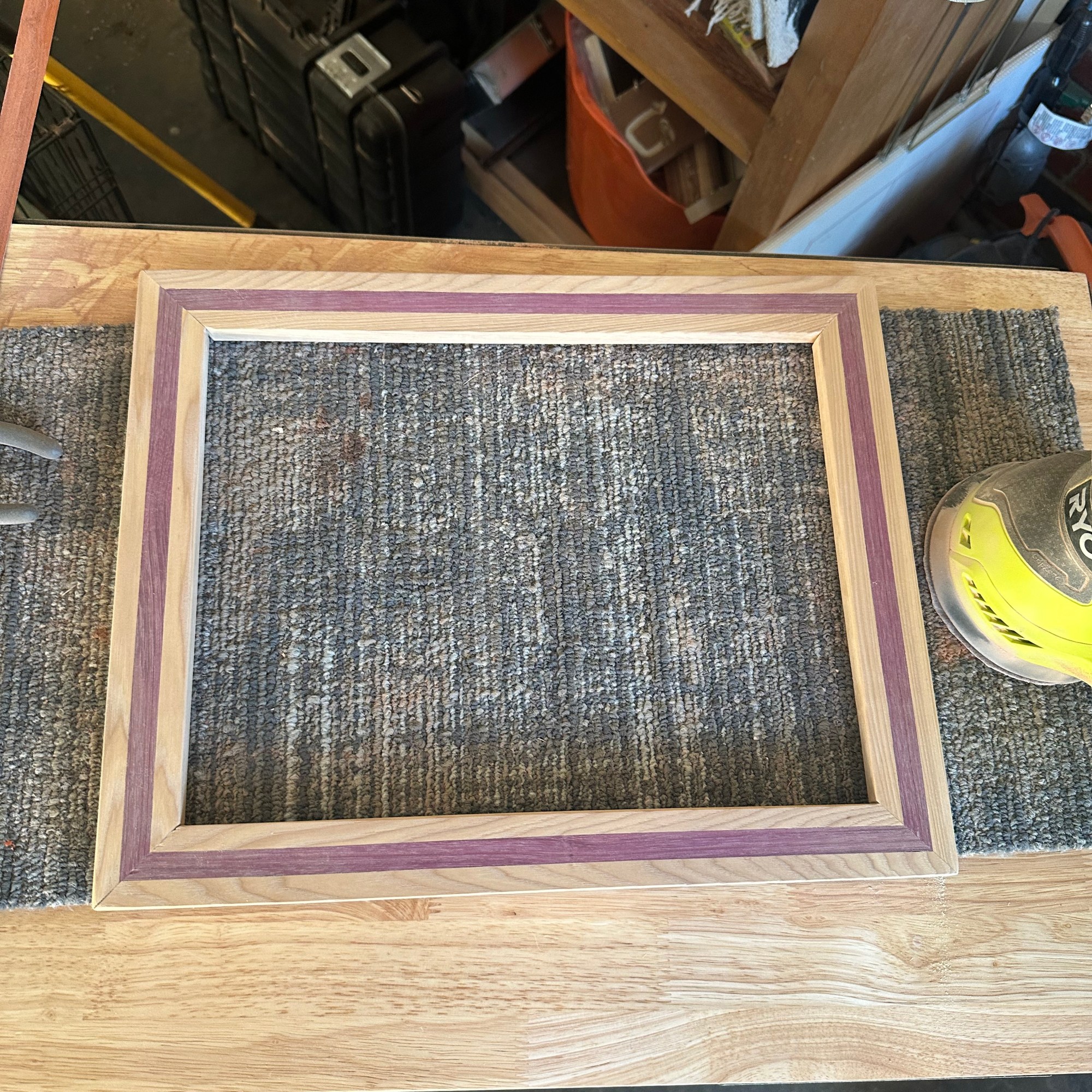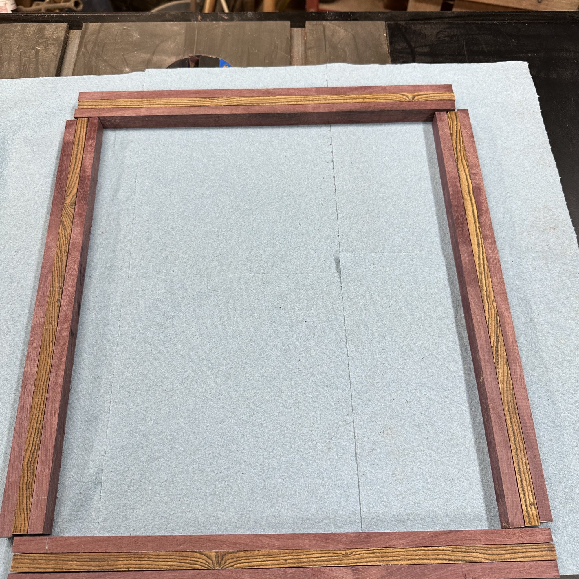 I felt that after so much time at college, and the nature of the design and work required for the degree I got, I figured it was only fitting to make my own diploma frame! To throw some more orange and purple in the project, the two woods I used are purpleheart for the outside layers and bocote for the inside layer.