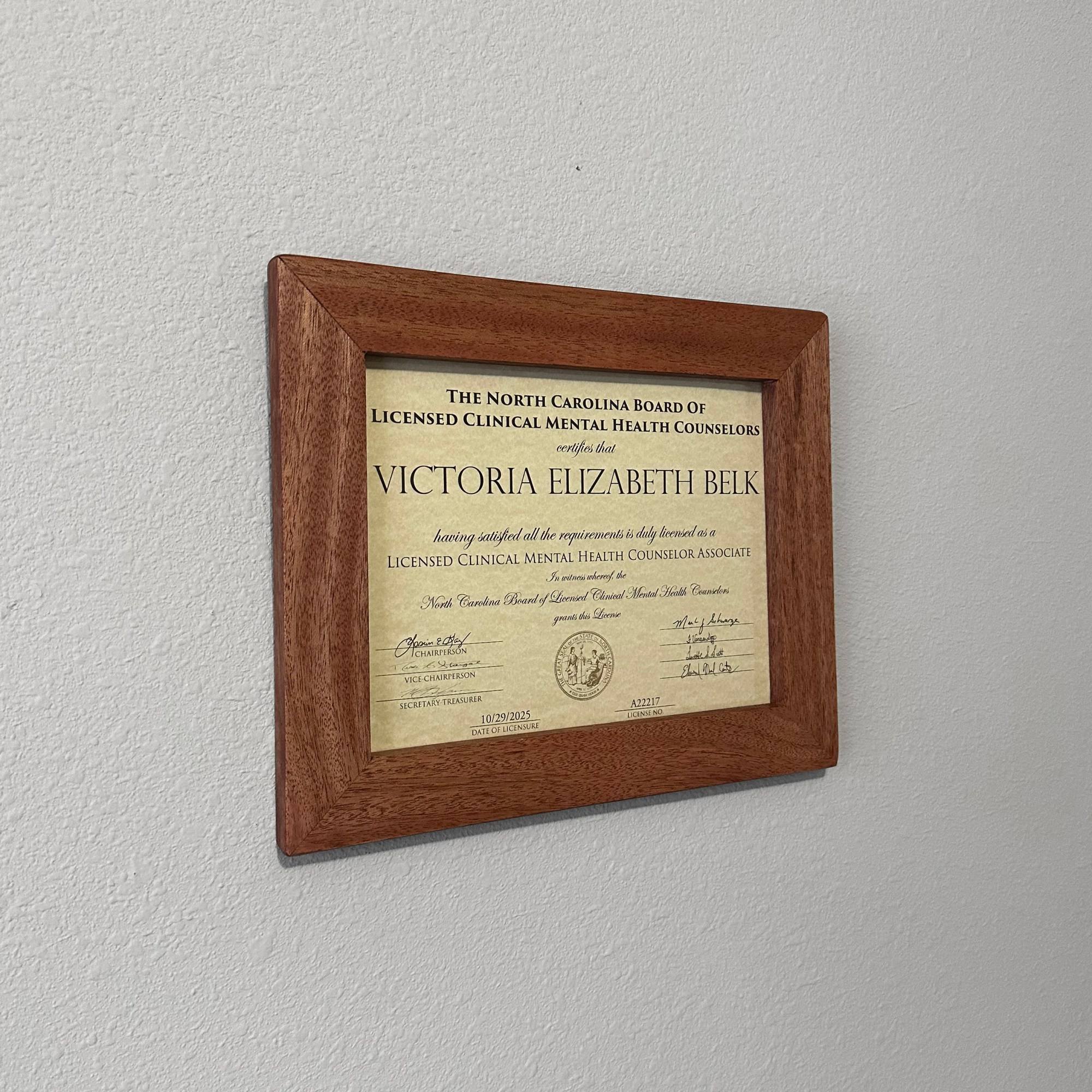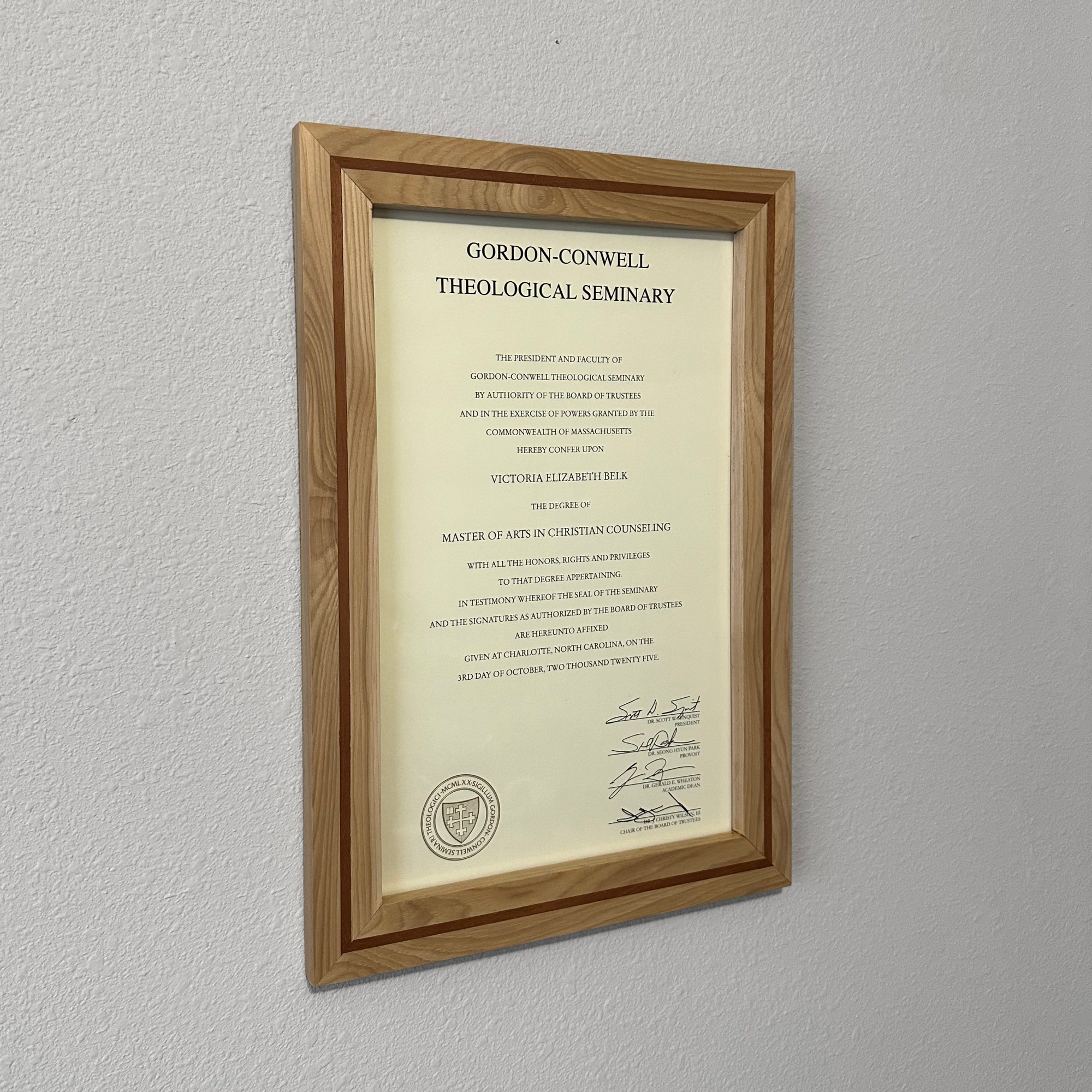 The following frames are a set I made for my wife to display her diploma and license in her office, after she became a licensed counselor! The larger frame is made with hickory and mahogany wood, and the smaller frame is all mahogany, so they look like a set when mounted together..